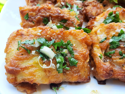 Na foliju sipati brašno, ribu premazati senfom provući krom marinadu i uvaljati u brašno. Redjati u podmazan pleh. Ja sam dodala i krompir koji sam uvaljala sa ostatkom marinade.