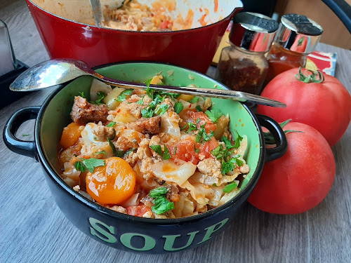 Pred kraj dodati začina i paradajz. Dinstati dok ne ispari tečnost.