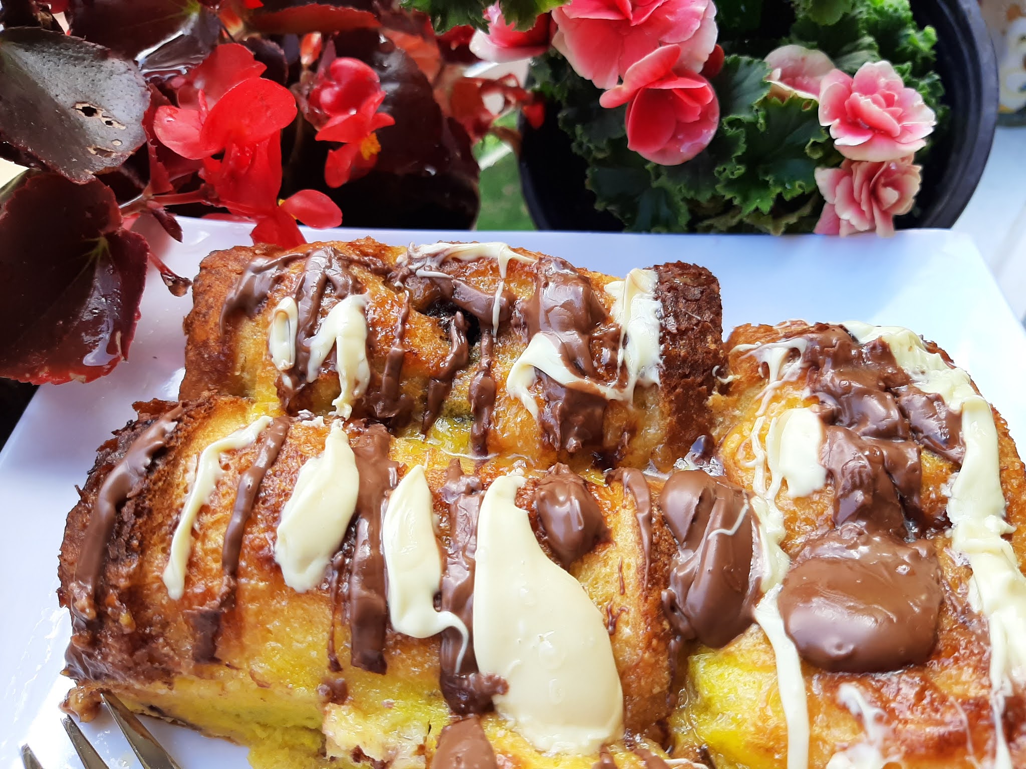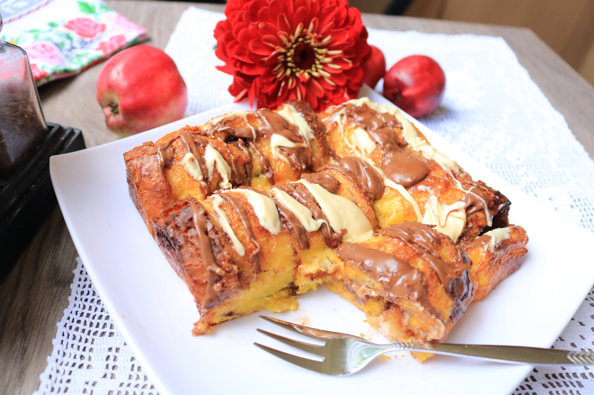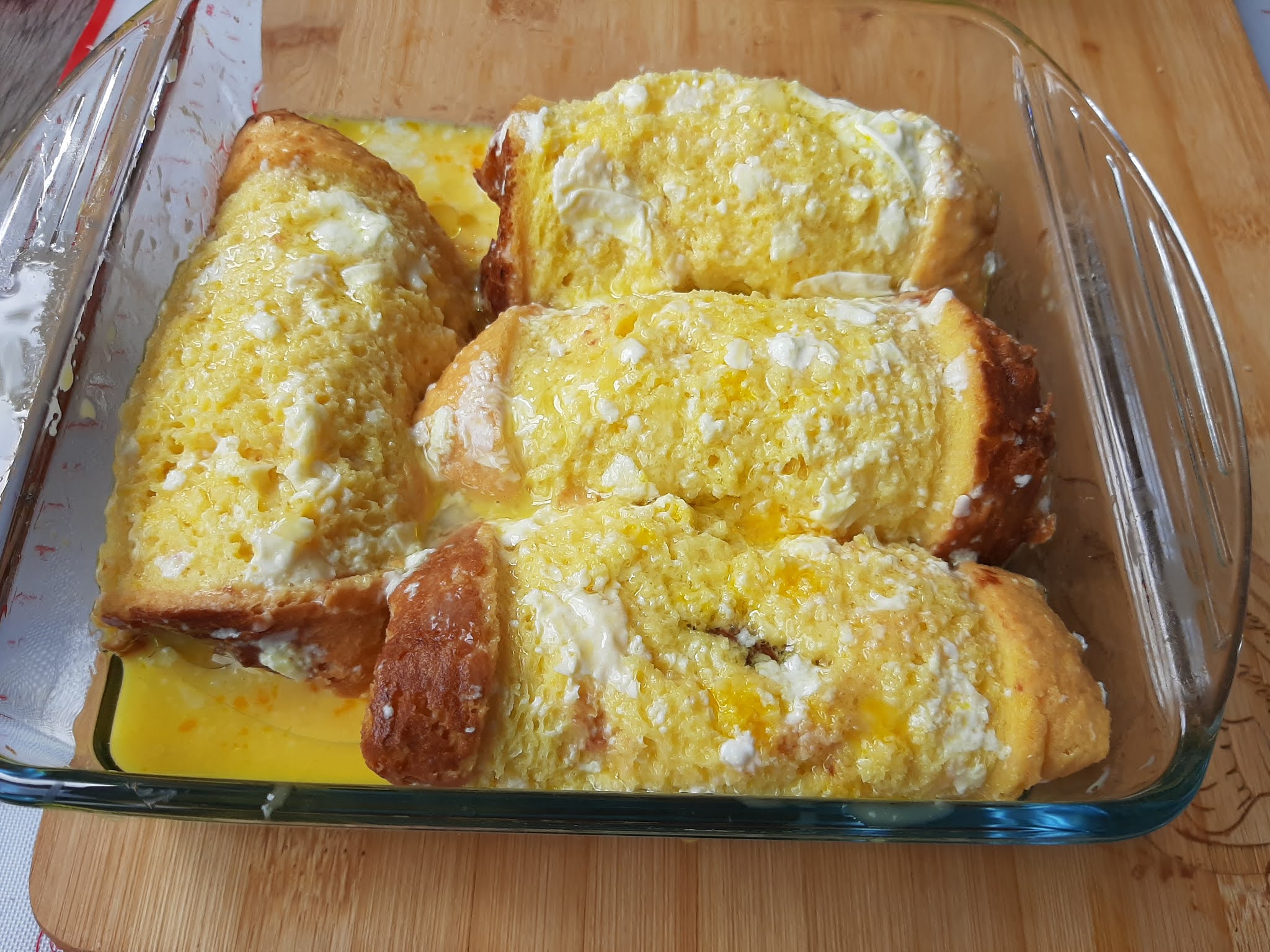 Rernu uključiti na 220 stepeni c. Hleb malo oklagijom izvaljati i premazati kremom. Jaja izmutiti i dodati 200-300 ml. mleka. Sve izmutiti.