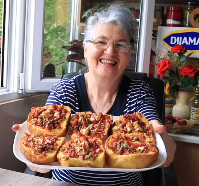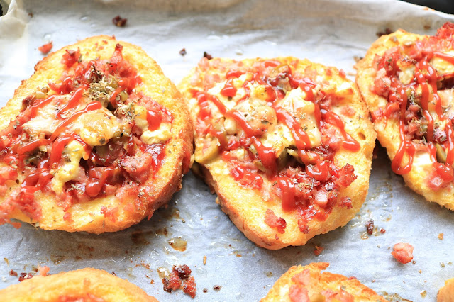 Svaku krišku hleba umočiti u sir i mleko i redjati u podmazan pleh. Odozgo staviti malo kečama seckane šunke i maslinki i po listić kačkavalja.