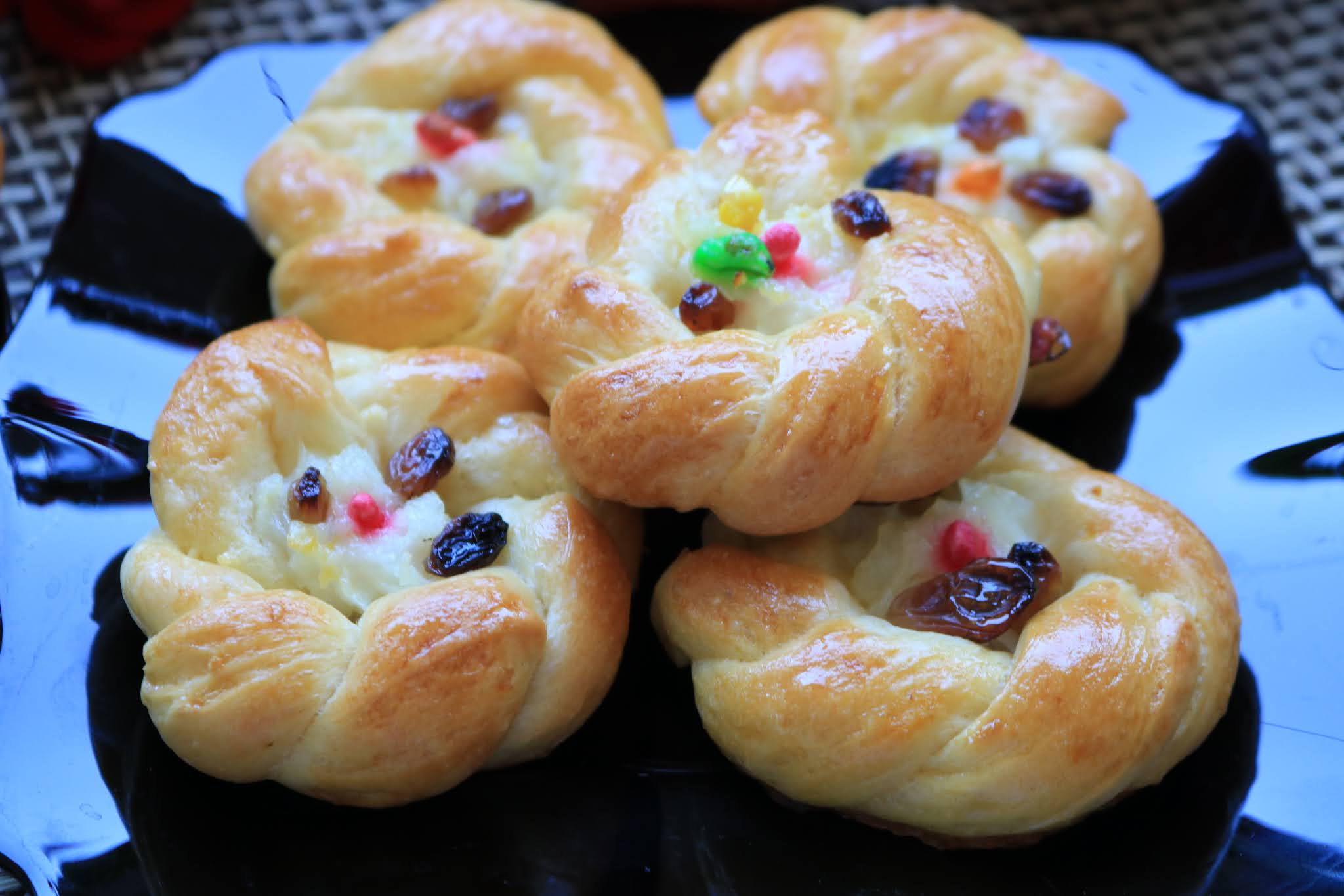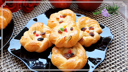 (arrange in a greased baking tray or lined with baking paper. Fill the circle of the braid with pudding with a syringe and put some raisins and rice on top of the pudding)