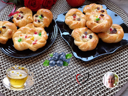 (Cover to rise a little, then coat with egg yolk when you put a spoonful of milk and a little oil. Bake at 220 degrees C for about 20-25 minutes. Enjoy … bright pastries that you can roll in powdered sugar)