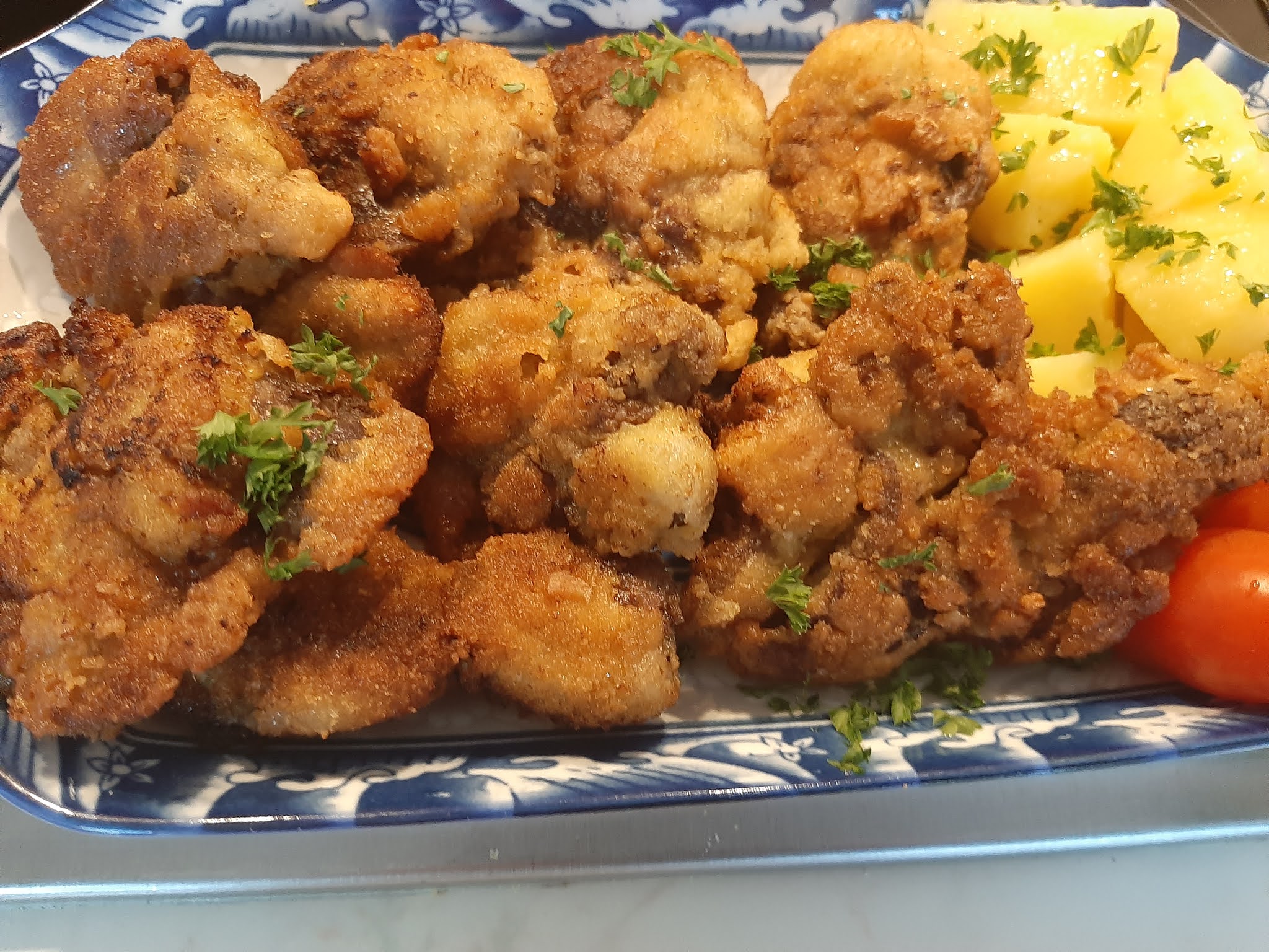(roll in flour, bathe profusely in the eggs you have settled and add a little salt and then in breadcrumbs.)