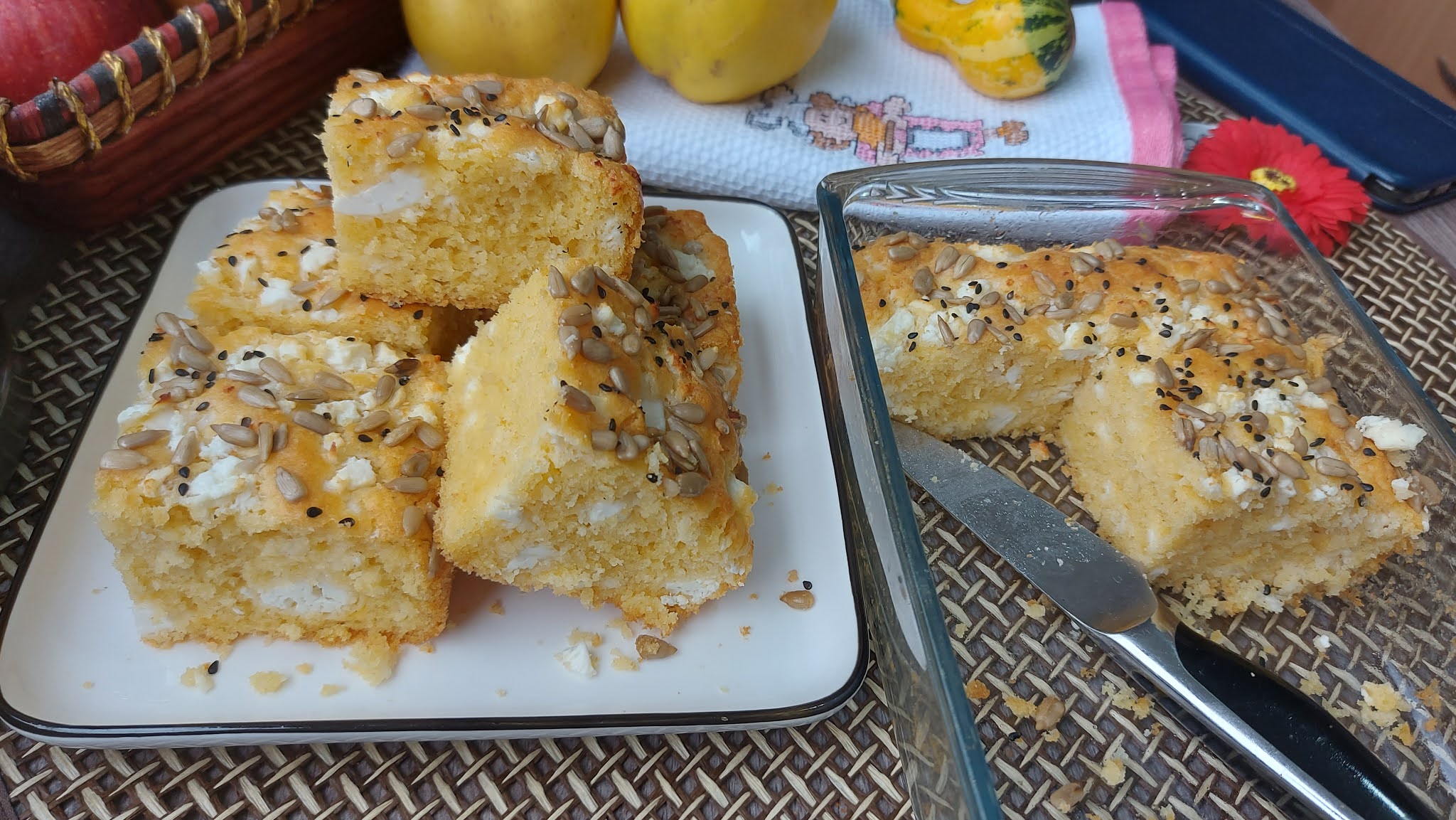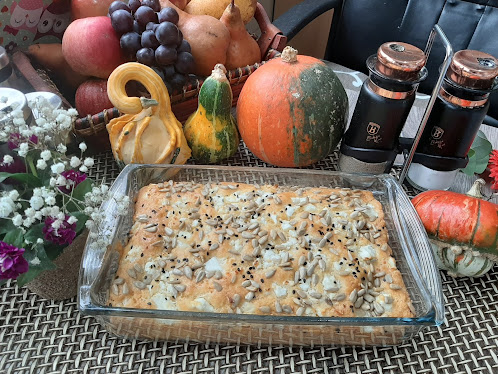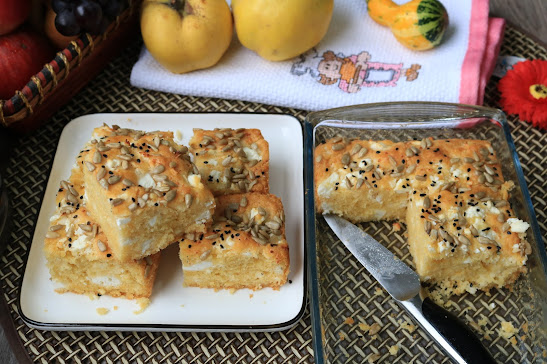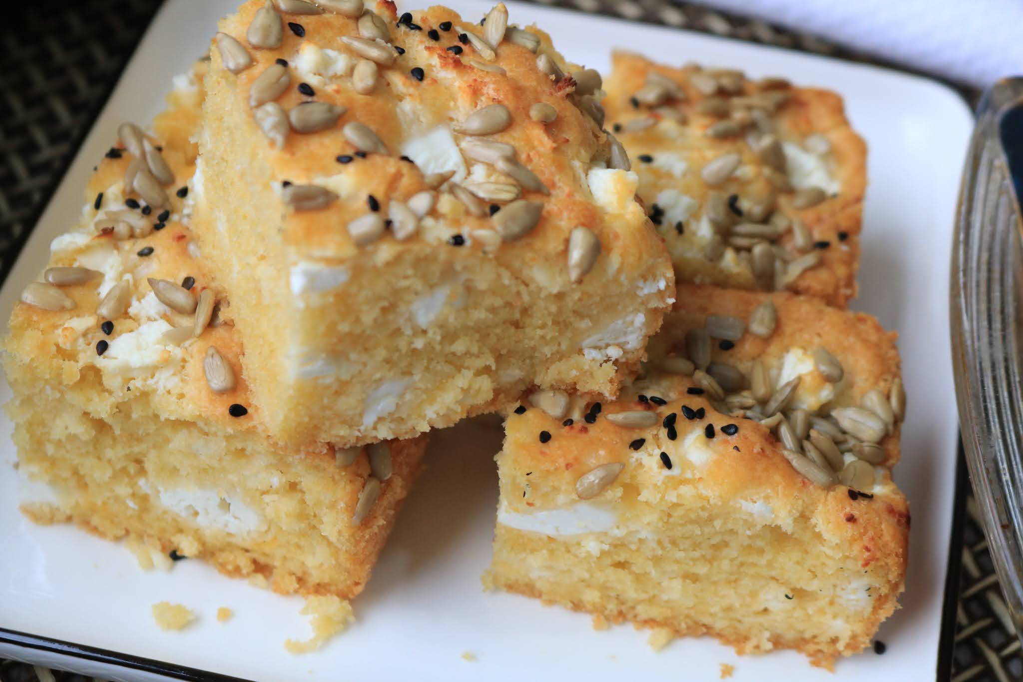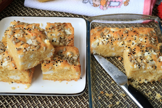 (pour into a greased pan and sprinkle a little more cheese and seeds as desired. Bake at 190 degrees C for about 40 minutes.)