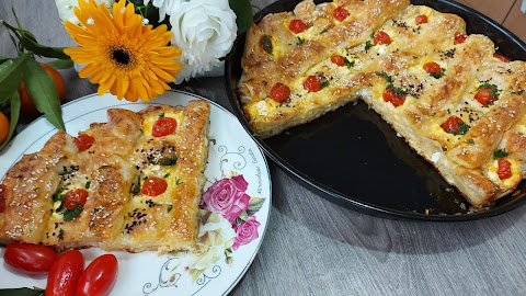 Izmedju stavljati kašičicu tvrdog sira i žumance i po malo seći paradajza čeri. Premazati uljem sve i preliti ostatkom fila. Posuti malo susamo peći na 200 stepeni C oko 50 do sat vremena. Seči i uživati u savršenbom ukusu..