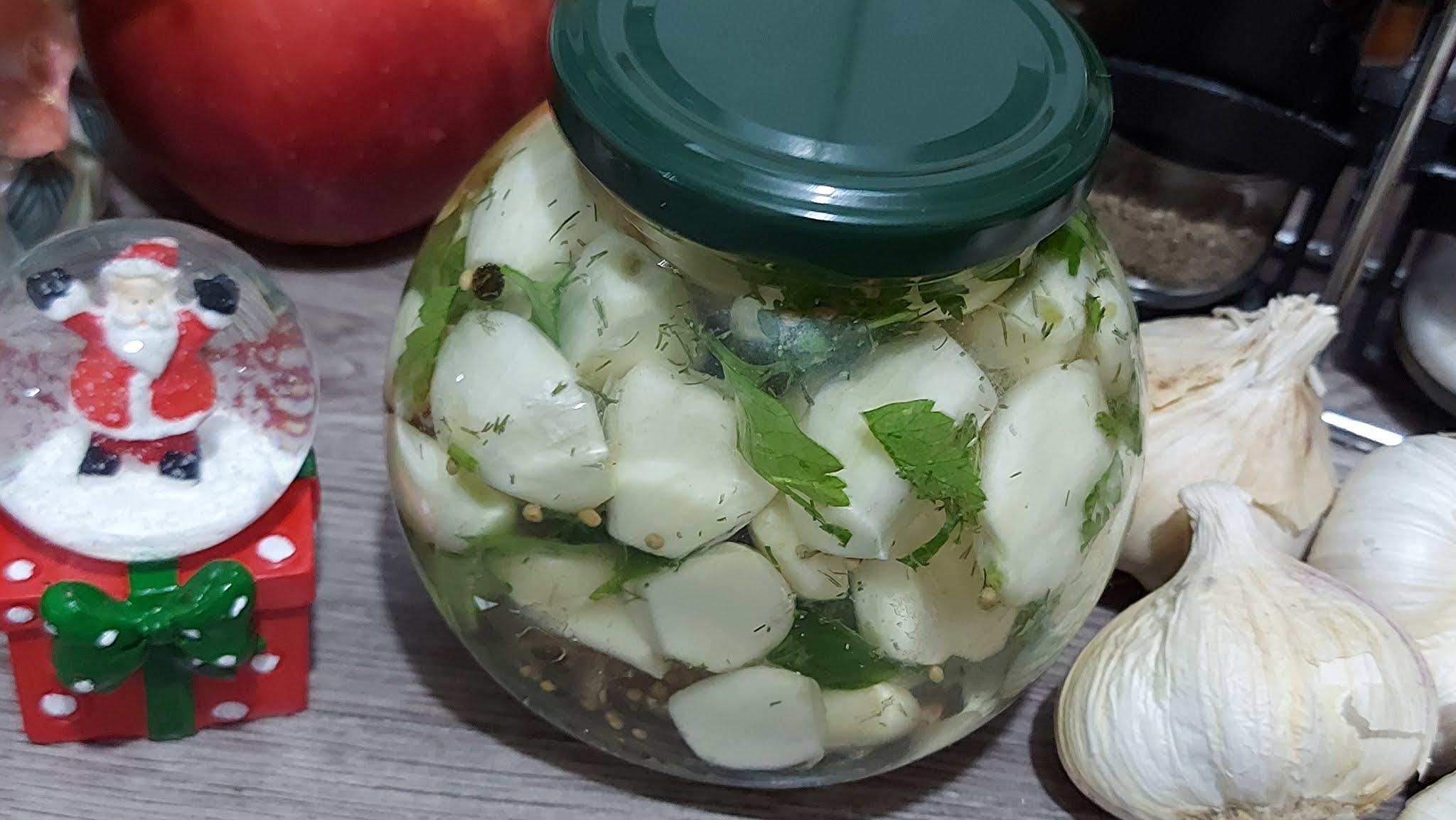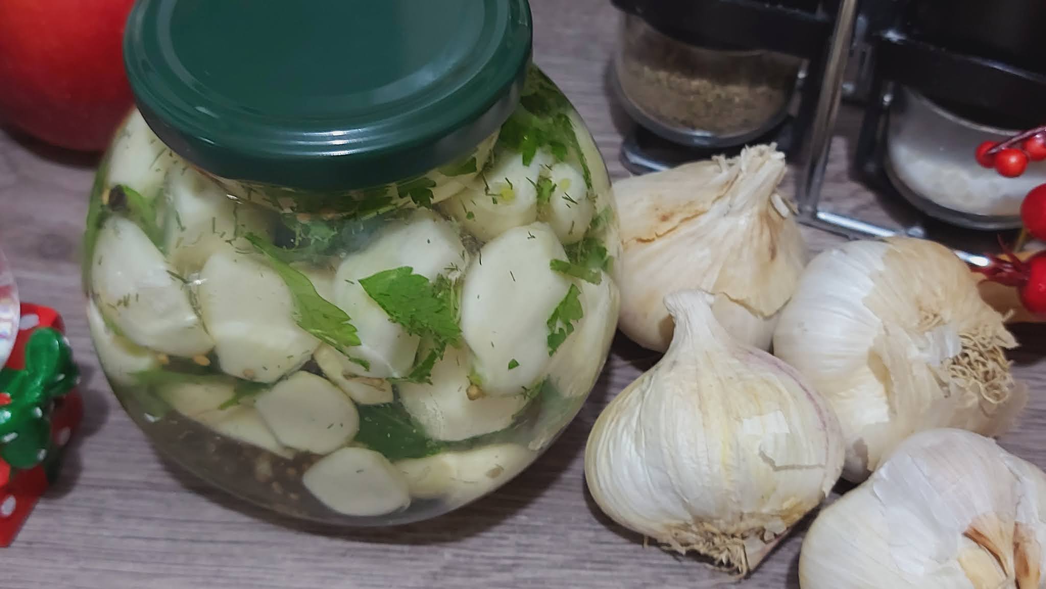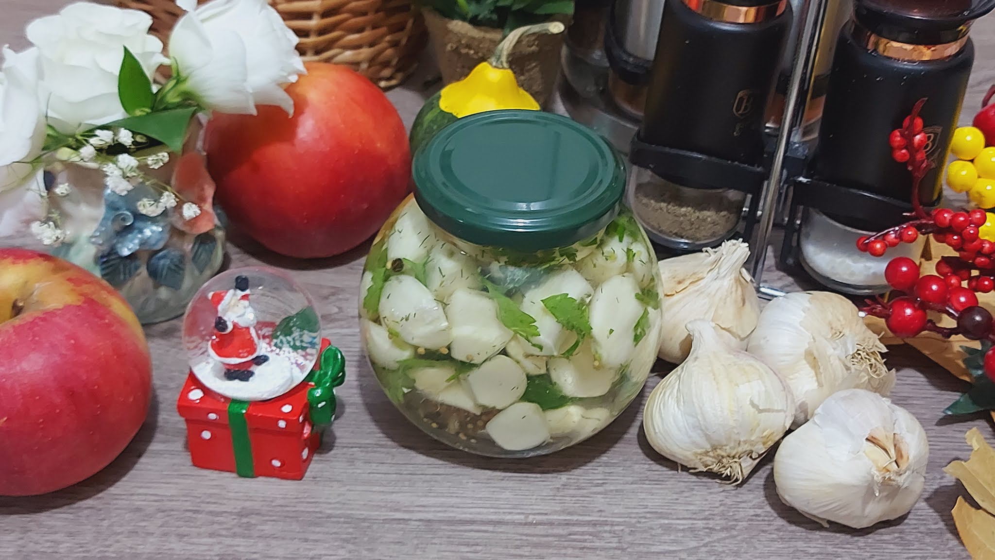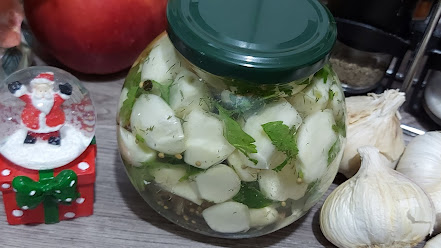 Beli luk očistiti . U činiju sipati vodu, dodati sirće, so i šećer i sve dobro izmešati da se istopi. U opranu treglu ubaciti beli luk, biber, slačicu, peršun i malo mirodjija
