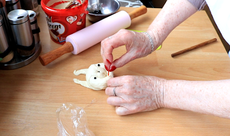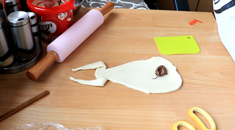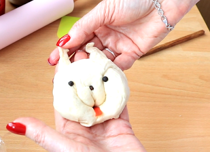 U donji deo staviti nadev pa uviti ne do kraja sasvim i sastaviti donje krajeve. Staviti zeki oči može od borovnice ili aronice kao i nos a jezik imitacija od žele bombone.