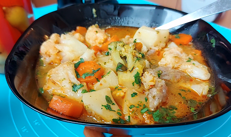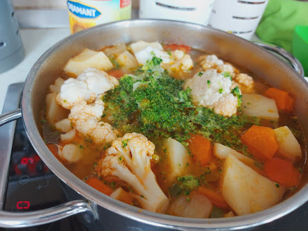 Posle 5-6 min dodati krompir i malo vode . Na pola kuvanja ubaciti na kocke sečen krompir a pred kraj cvetove karfiola i brokolija. Kuvati još dvadesetak minuta.