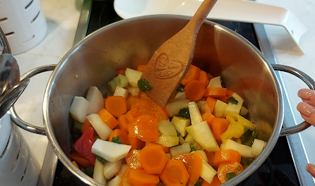 Na ulju propržiti seckan luk mladi i doodati na krugove šargarepu i papriku, zatim na kocke celer . To dinstati na veoma tihoj vatri.