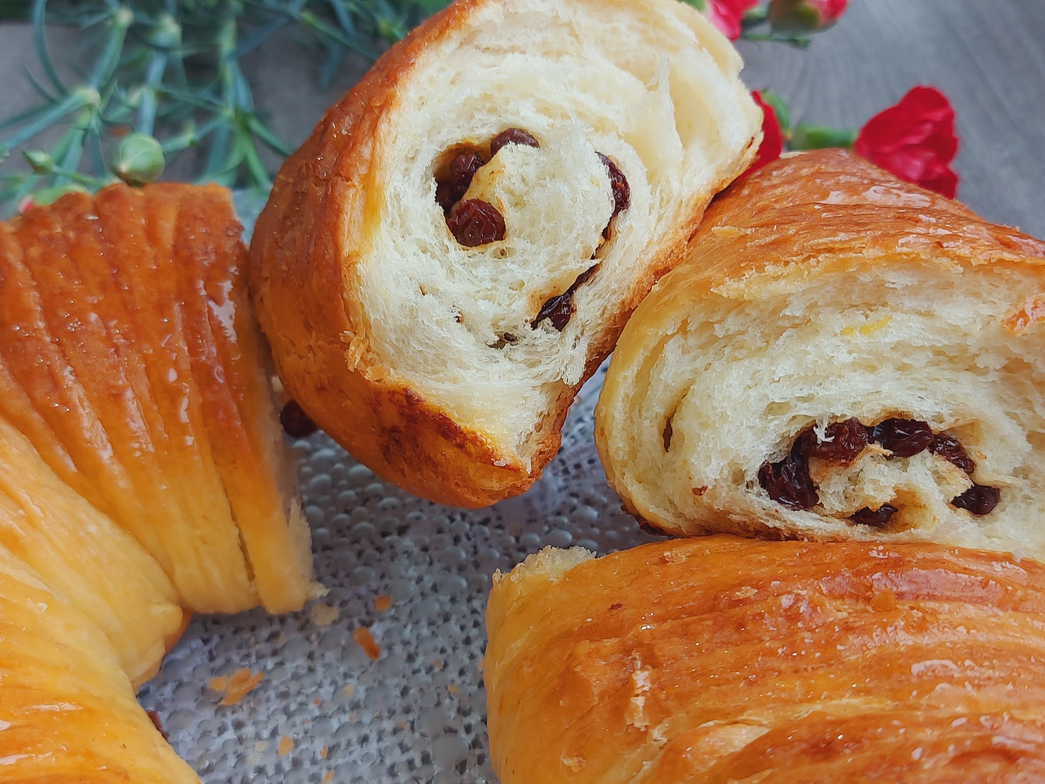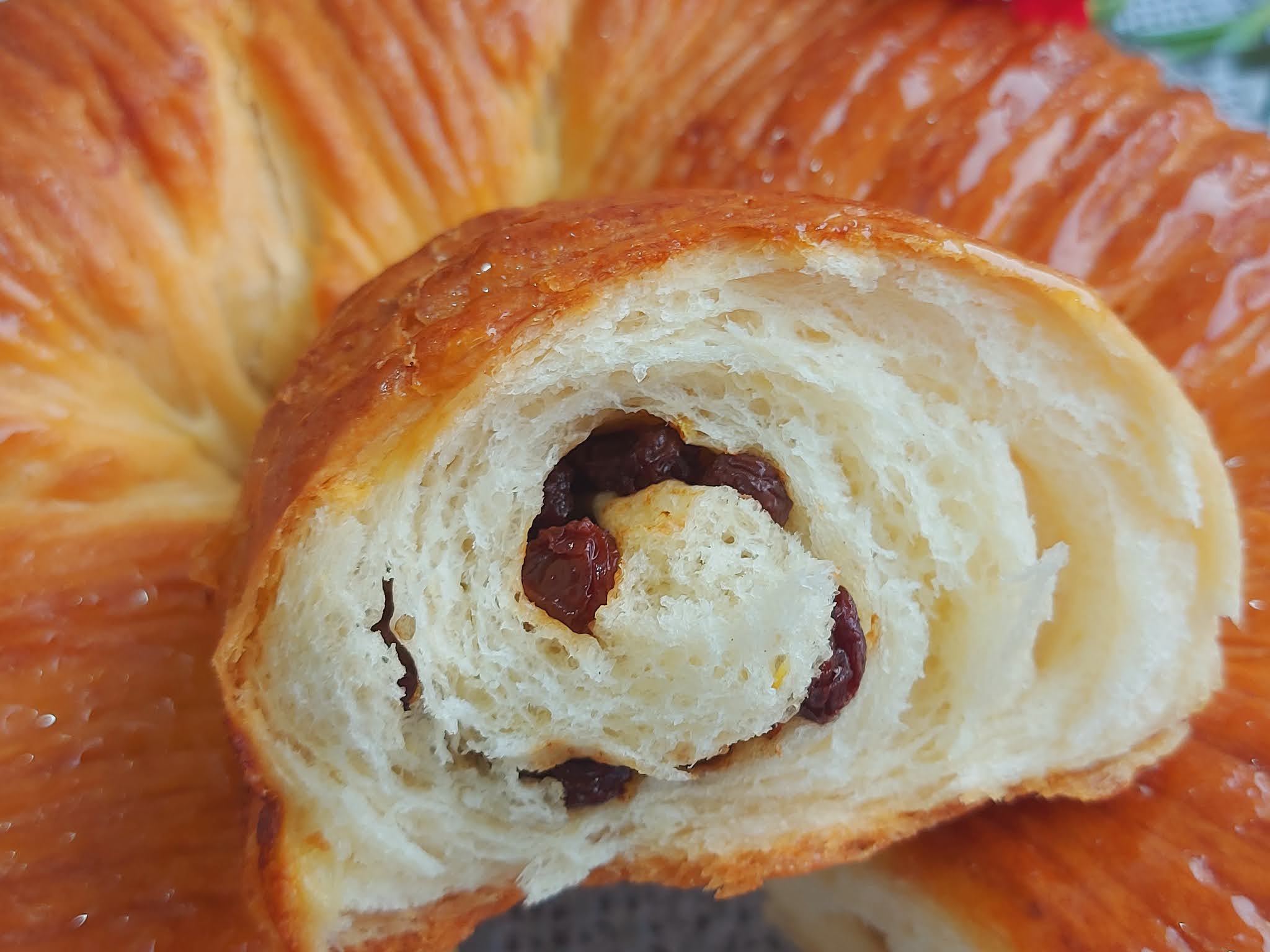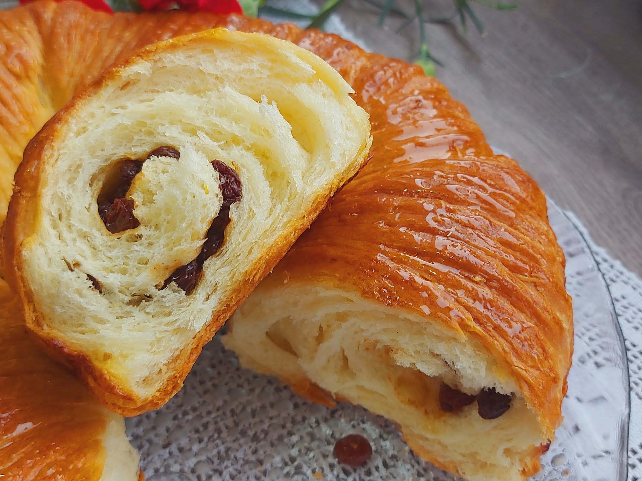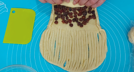 U donji deo staviti suvo groždje koje smo potopili u mlaku vodu i malo ruma. (ocediti) Gornji deo testo iseći na taanke trakice koliko se može.