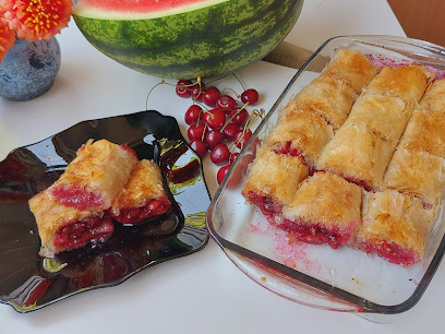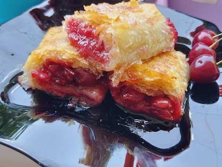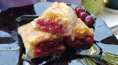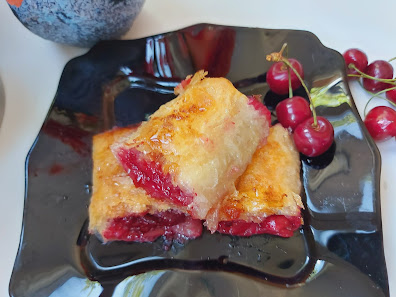 Najbolje ako imate pumpicu sa prskalicom. . Četiri kore tako sastaviti jednu preko druge i na zadnju u dnu poredjati po želji višnje i uviti.
