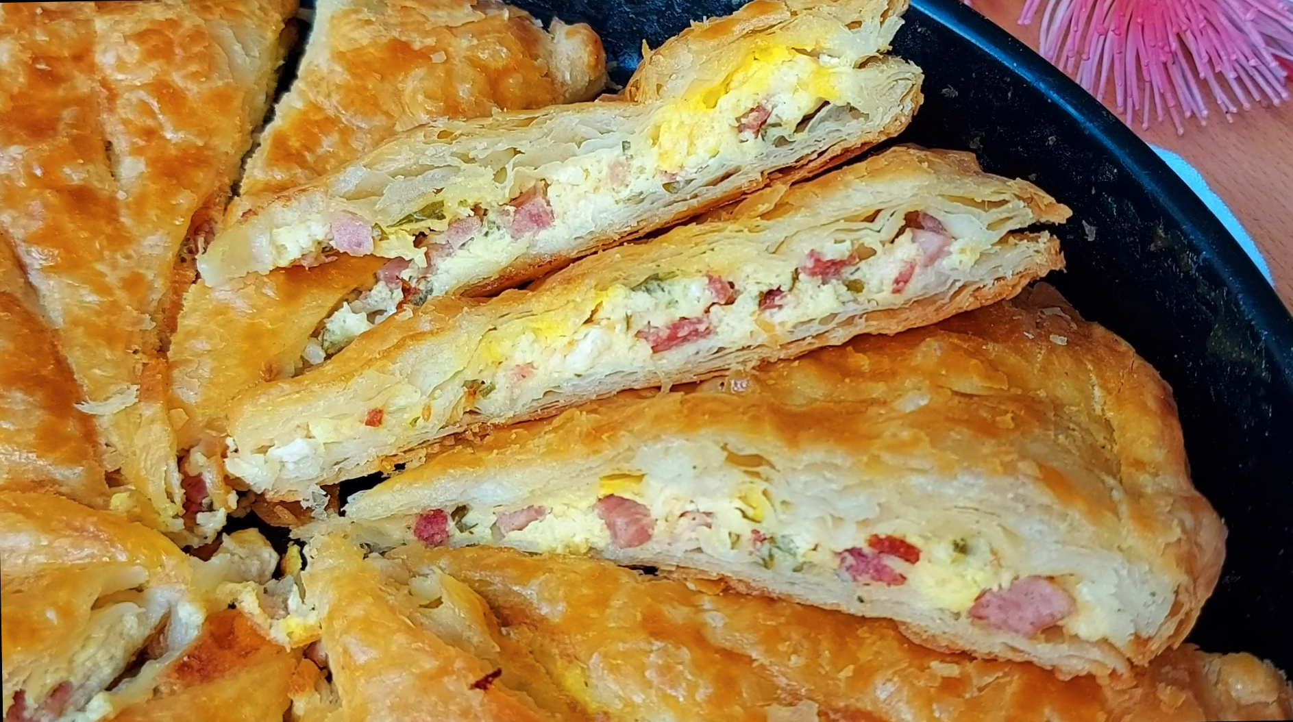 Premazati sa omekšanim maslacom pa svaki trougao prebaciti na sredinu gde je čaša. Prilikom svakog prebacivanja premazati maslacom. Razviti za pola cm i staviti u pleh podmazan maslacom , U sir staviti jaje i seckanu šunku i izjednačiti.